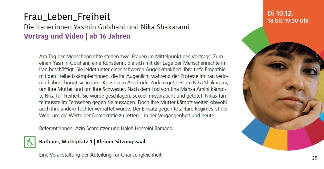 Bei der Sonderveranstaltung der Stadt Stuttgart anlässlich des Internationalen Tags der Menschenrechte und zum Gedenken an Nika Shakarami wurde der Kurzfilm „Wir sind zahlreich“ gezeigt. Die Dokumentation von Azin Schmutzer, Mitglied der ILF und stellvertretender Bezirksbeirat der FDP Stuttgart-West, beleuchtet die Werke und das Engagement der iranischen Künstlerin Yasmin Golshani im Kontext der iranischen Revolution.